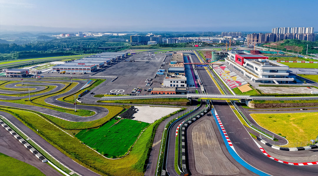成都天府国际赛车场位于简阳市简州新城石盘镇花红村,距成都市中心直线距离约39.5公里,一期西赛道设计占地面积约1000亩,按照国际汽车运动联合会最新技术标准设计的国际汽联二级赛道。西赛道全长3263.728米,宽14米-16米,共计19个弯道,其中设12个左弯、7个右弯;设4个上坡段、3个下坡段,最大上坡纵坡坡度5.141%,最大下坡纵坡坡度4.968%;最大直线段长589米。采用全球领先的Mylaps X2智能化计时计分系统和FIA认证的安全警示灯板系统,可举办各类型房车、方程式、摩托车场地赛,还可举办公路自行车、马拉松等综合体育赛事。后场面积约42000平米,可举办各类国家级、地区性汽车飘移赛事,同时也是各类商业活动、演唱会的优选场地。